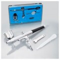 Міні-аерограф з набором аксесуарів INTERTOOL PT-1504 застосовується для нанесення промислового графіки, ілюстрацій, ретушування фотографій і т. П. Аерограф має робочий тиск 1-3,5 атм, витрата повітря до 50 л / хв. Діаметр форсунки становить 0,3 мм. Міні-аерограф поставляється разом з бачком, об'ємом 70 мл. Також, комплект поставки PT-1504 включає піпетку-дозатор, ключ для форсунки і пластиковий футляр. Корпус і бачок виготовлені з металу