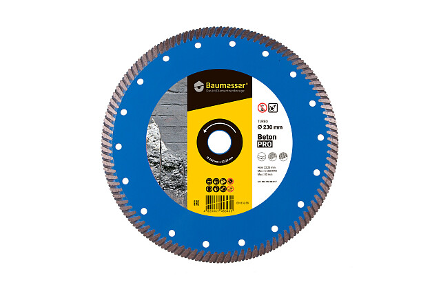 Круг алмазный отрезной Baumesser Turbo Beton Pro является отличным решением для работы с бетонными изделиями. В целом инструмент применяется для широкого спектра материалов. В большей степени используется для резки бетона и бетонных изделий, а также при работе с кирпичом и тротуарной плиткой.