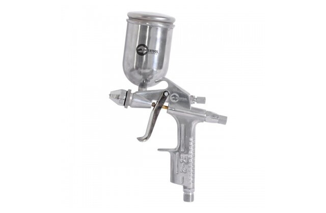 Пневматичний краскопульт INTERTOOL PT-0303 відмінно зарекомендував себе як бюджетну модель для проведення фарбувальних, тоніровочних і лакувальних робіт на невеликих за площею поверхнях. Він сконструйований за технологією НР (High Pressure), що має на увазі під собою використання високого тиску з відносно низькою витратою повітря. Працювати з РТ-0301 зручно і легко за рахунок ергономічності дизайну і простоти конструкції. Краскопульт оснащений металевим бачком місткістю 200 мл, верхнім розташуванням і можливістю регулювання кута нахилу на 360о. Дана модель дуже економічна. При робочому тиску до 5 Атм, витрата повітря не перевищує 130 л / хв. Форсунка діаметром 0,5 мм забезпечує рівномірне нанесення ЛФМ овальним факелом. Ідеально підходить для тонування, розкриття лаком і фарбування невеликих поверхонь;