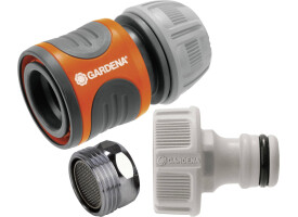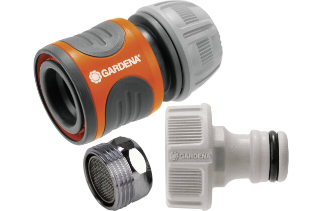 Набір приєднання Gardena (18285-20.000.00) включає в себе коннектор для шлангів діаметром 13 - 15 мм (1/2 "- 5/8"), штуцер і перехідник для підключення до водопроводу. Конектор має сучасний дизайн і нову запатентовану форму затискної гайки, яка забезпечує ідеальне поєднання коннектора і шланга. Поверхня коннектора виконана з м'якого рифленого пластика і дозволяє зручно і надійно утримувати коннектор Гардена в руці. Конектор Gardena оснащений гумовим кільцем, яке забезпечує захист від пошкоджень.