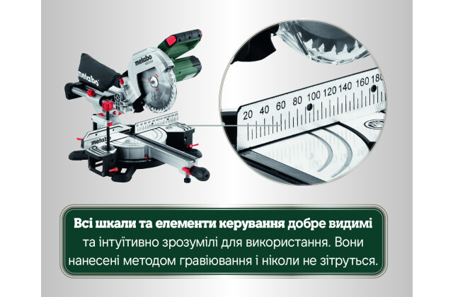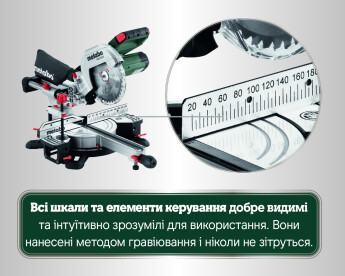 - Пиляльна голова нахиляється ліворуч, з додатковою кутовою зоною для заднього розпилу