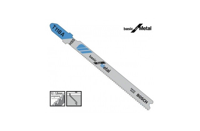 Пилка для лобзика Bosch Basic for Metal T 118 A виготовлена зі швидкорізальної сталі (HSS). Має хвилясті прогресивні зуби з кроком 1,1-1,5 мм, виконані методом фрезерування. Призначена для прямолінійних різів тонкого листового металу (1-3 мм).