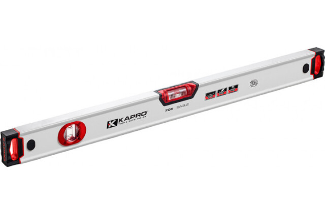 Уровень Kapro Eagle 1000 мм (705-40-100) оснащен 3 твердыми акриловыми противоударными колбами - 2 вертикальных. Optivision красная наклонная горизонтальная колба с градиентными линиями наклона до 2%. Точно фрезерованная поверхность. Мост в горизонтальной колбе усиливает профиль. Беспрерывная маркировка кромки. Настенный захват. Концевые крышки из двух материалов. Точность 0.5 мм/м.