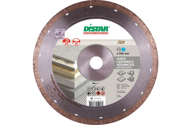 ОПИСАНИЕ Диск алмазный сплошной Distar 1A1R Hard ceramics Advanced 250x25,4x1,5мм (11120349019) : Алмазный диск HARD CERAMICS ADVANCED специально создан для резки толстого и прочного керамогранита. В состав алмазоносного слоя диска включены графитовые чипсы, которые создают микропористую структуру и выступают в роли твердой смазки. Алмазоносный слой подвержен лазерной сегментации, снижающий воздействие термических нагрузок на диск. Все это обеспечивает возможность эффективной резки толстой и прочной керамогранитной плитки. Диски выпускаются в диаметрах 200 - 350 мм, с посадочным местом 25,4 мм. Применяются на станках-плиткорезах с охлаждением водой.