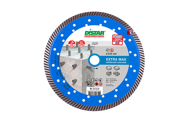 Диск способен обеспечивать максимально надежную работу на протяжении всего срока эксплуатации, при достаточно высоком уровне производительности (до 1,1 погонного метра в минуту при резке армированного бетона М-400).